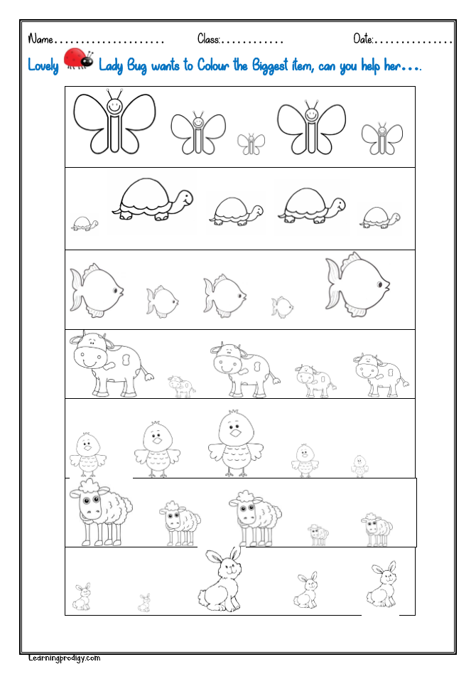 Colour the biggest item Colour the biggest item In this worksheet colour the biggest item. Click the below link for free PDF download. Colour-the-biggest- Download For more Maths Worksheets click the below button. Maths Worksheets Share this: Share on Facebook (Opens in new window) Facebook Share on WhatsApp (Opens in new window) WhatsApp Share on Pinterest (Opens in new window) Pinterest Share on X (Opens in new window) X Share on LinkedIn (Opens in new window) LinkedIn Print (Opens in new window) Print Email a link to a friend (Opens in new window) Email Like this:Like Loading... Recent Worksheets Post navigation Previous article Circle the Smallest itemNext article Maths Activity | Practice Worksheet for Nursery Kids