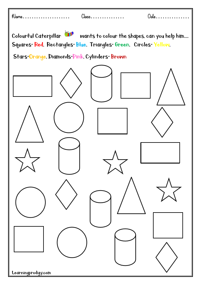 Make the worksheet colourful by colouring the shapes with the mentioned colours.